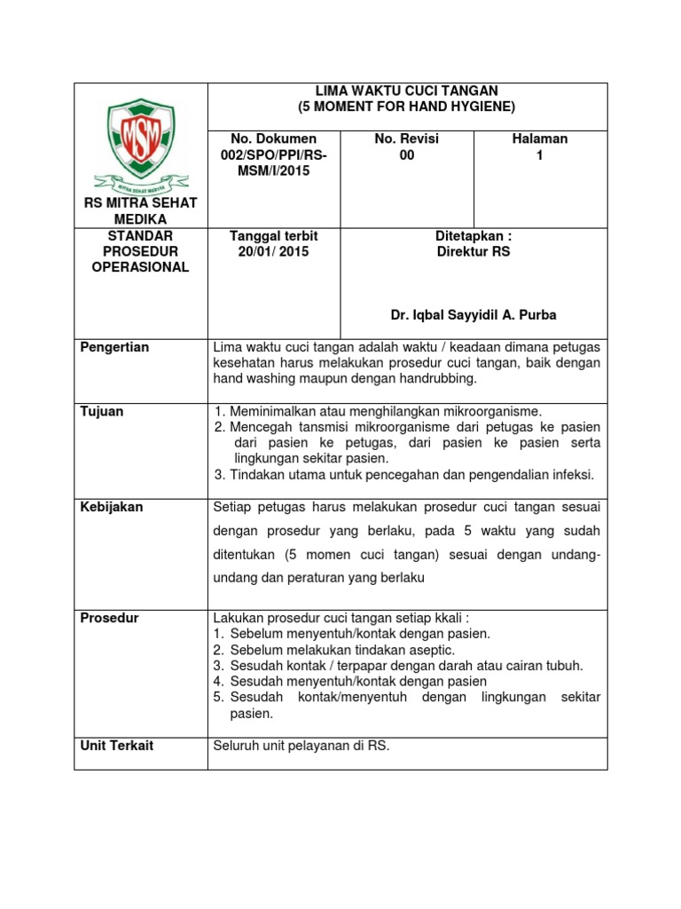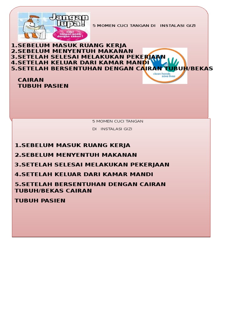 Berikut informasi sepenuhnya tentang 5 momen cuci tangan di rumah sakit. Cuci tangan ini dilakukan pada saat 5 (lima) momen atau yang sering disebut 5 (five) moments for hand hygiene. Benar dan tepat, yaitu 6 langkah cuci tangan, 5 moment cuci tangan dan ketepatan durasi waktu yang dibutuhkan apabila menggunakan handrub dan handwash. A) sebelum masuk ke dalam area produksi dan distribusi, b) setelah memegang bahan mentah/ kotor, c) setelah memegang anggota tubuh, d) sebelum dan Perawat kurang menyadari bahwa tangan Setelah terkena cairan tubuh pasien. Dari hasil uji korelasi rank spearman didapatkan ada hubungan motivasi dengan kepatuhan cuci tangan enam 5 moment (five moments) cuci tangan dibawah ini yang benar. Nasional berperilaku benar dalam cuci tangan adalah gambar 1. Gambar 5 moment mencuci tangan: 15 16 1) sebelum kontak dengan pasien indikasi ini bertujuan memutus kejadian kontak terakhir dengan lingkungan petugas kesehatan serta kontak selanjutnya dengan pasien. Melakukan cuci tangan enam langkah lima momen dengan kejadian phlebitis (p = 0,031). Berikut gambar 5 moment mencuci tangan: